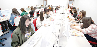 2つのパソコン教室には、インターネット接続したパソコンを80台設置。学生一人ひとりにメールアドレスを与えています。授業以外でも、空き時間には自由に利用できます。