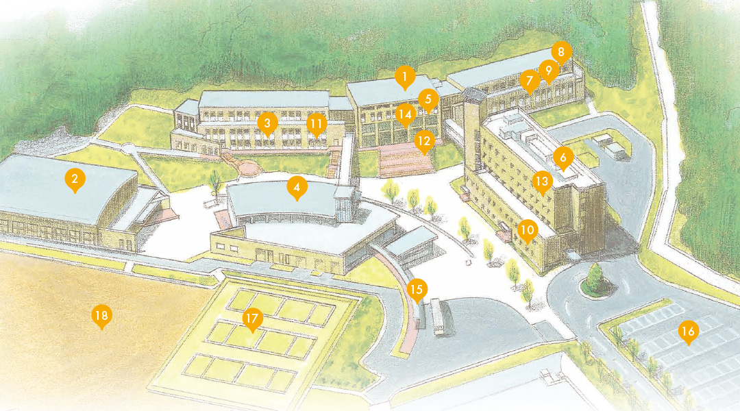 緑の丘に建つ日高キャンパスは、’99年に誕生したきれいなキャンパスです。クヌギの林や小川のせせらぎが聞こえる心地良い学習環境が自慢です。最先端の設備を整えるモダンな校舎群とともに知性や人間性を伸びやかに育み、2年間の有意義な学生生活を創ります。